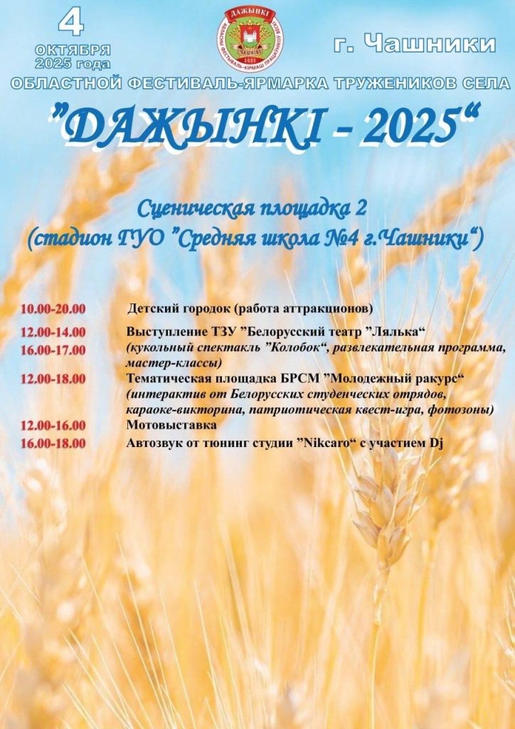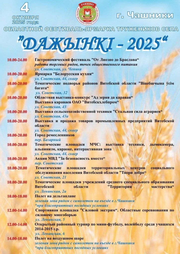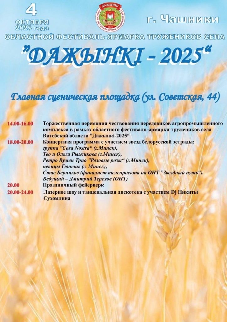 Программа областного фестиваля-ярмарки тружеников села “Дожинки-2025” Наталья Храповицкая - Сельское хозяйство - 02.10.2025 Наталья Храповицкая 25 просм. 0 Комментариев Представляем вашему вниманию программу проведения областного фестиваля-ярмарки тружеников села “Дожинки-2025” 4 октября 2025 года в Чашниках будет очень интересно. Приглашаем всех желающих. Развлечения по душе найдется для каждого Предыдущая Александр Лукашенко рассчитывает к 2030 году достичь товарооборота с Кыргызстаном в $500 млн Следующая До областного праздника “Дожинки” остаются считанные дни. Чашники заметно переобразились