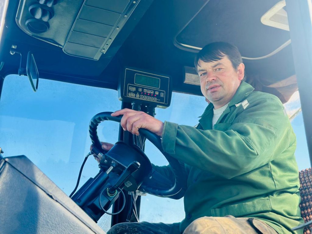 За рулем – Владимир Седин. Опытный аграрий, в УП “Юрковщинское” трудится уже более 10 лет. Мужчина точно знает: сельское хозяйство – сфера, где трудолюбие, ответственность, любовь к делу и дисциплина являются главными слагаемыми успеха.